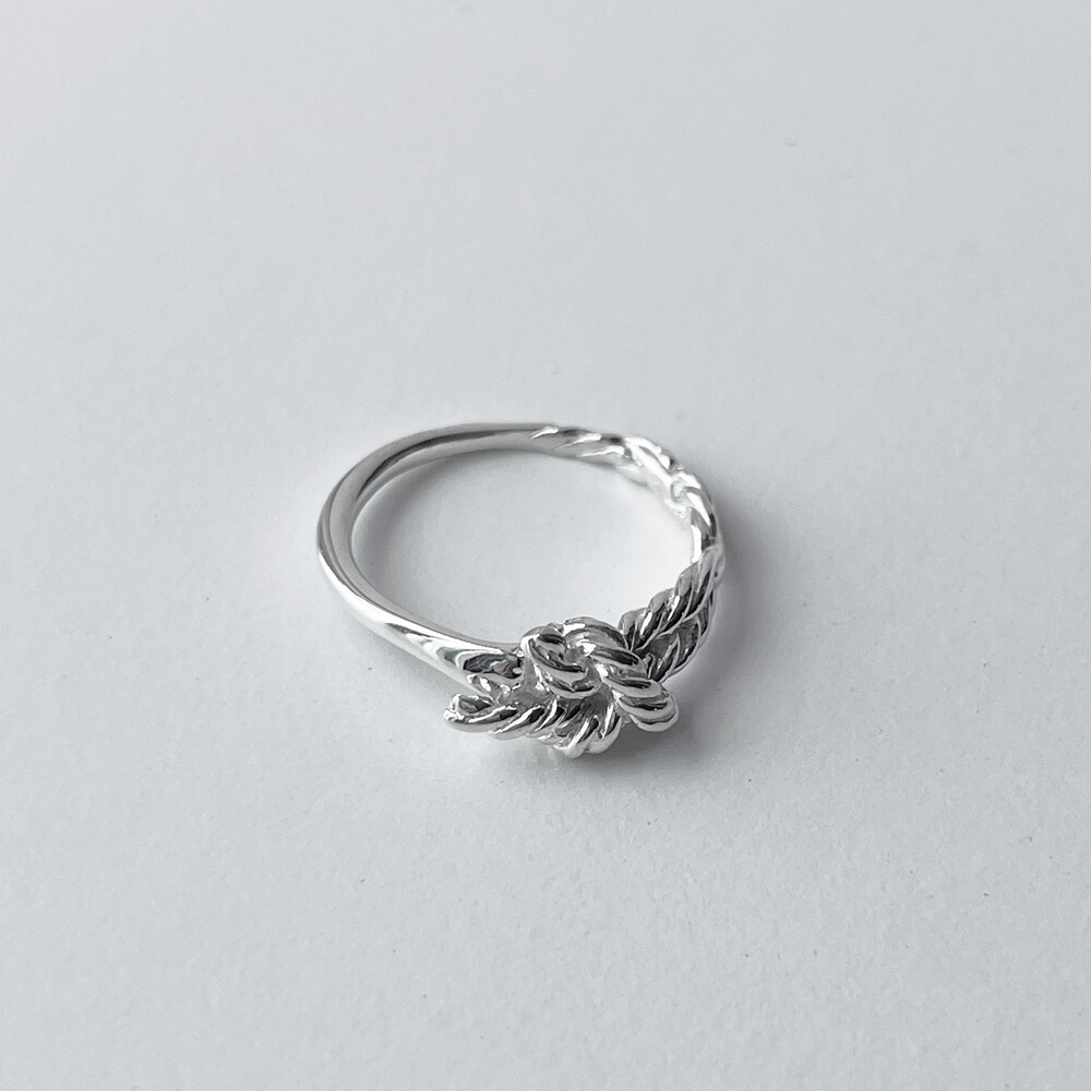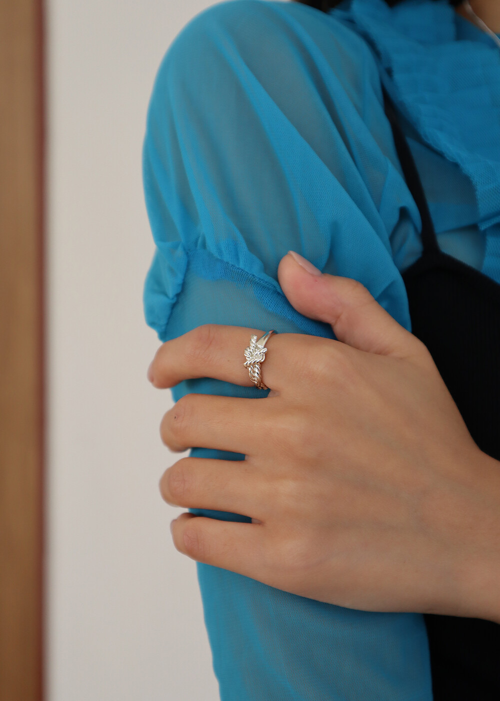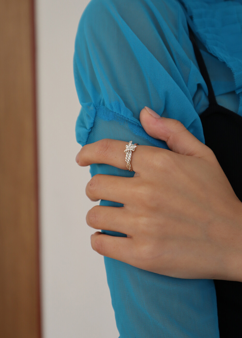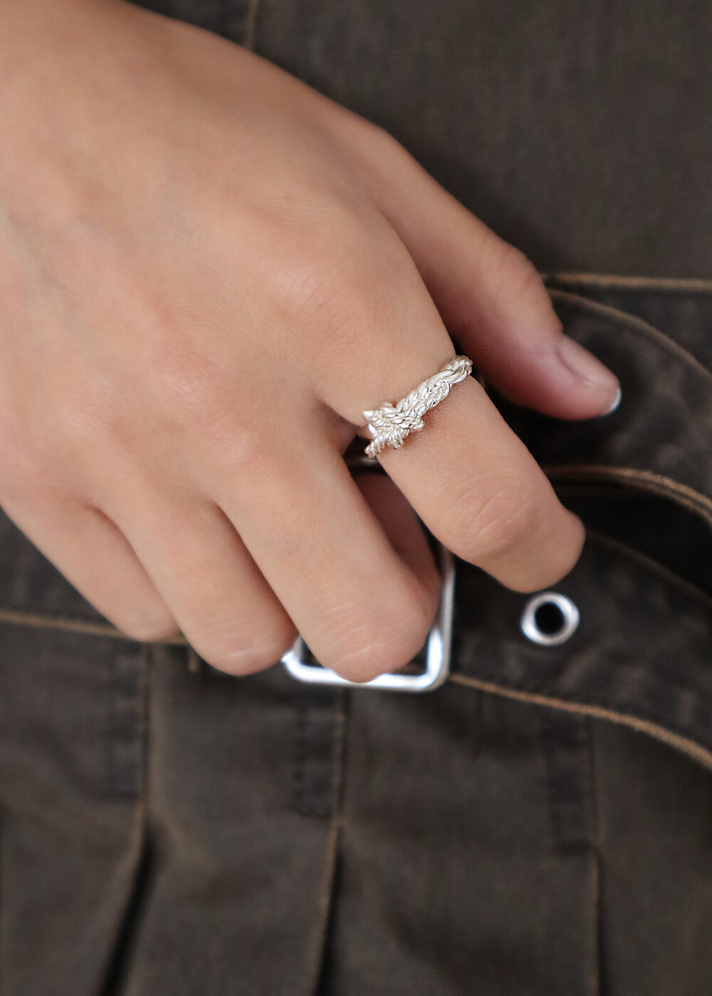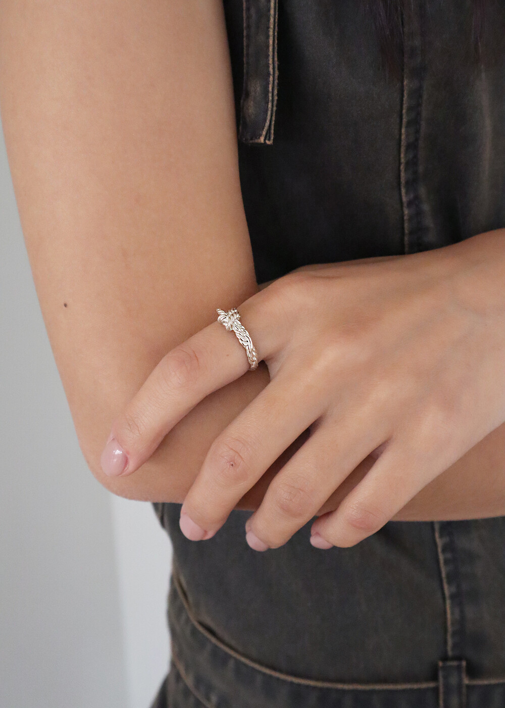 테스의 시그니처 꼬임패턴에서 한쪽만 섬세한 꼬임 디테일을 강하게 주어 유연한 곡선이 있는 반대쪽과 대비가 느껴지는 반지입니다. 비대칭의 디자인으로 취향에 맞게끔 각도를 돌려 착용하실 수 있습니다.