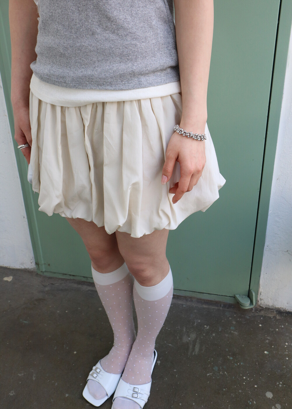 폼폼 거품같은 써지컬 볼들이 엮어져 있는 유니크한 팔찌입니다. 단독으로 착용해도 시원한느낌이 들어서 봄여름에 더욱 어울리는 제품이예요. 가벼운 무게와 변색없는 소재로 오랜기간 무리없이 즐기실 수 있습니다 :) 스크런치 머리끈 느낌도 나고 착용시 손목도 가녀려 보여서 쇼룸에선 반응이 아주 좋았답니다.