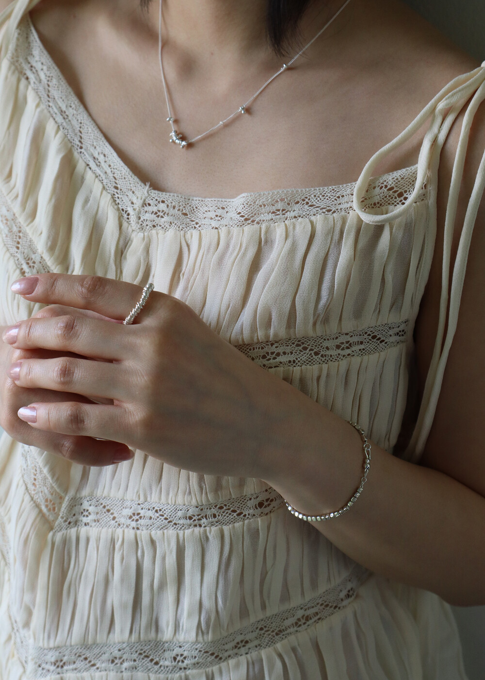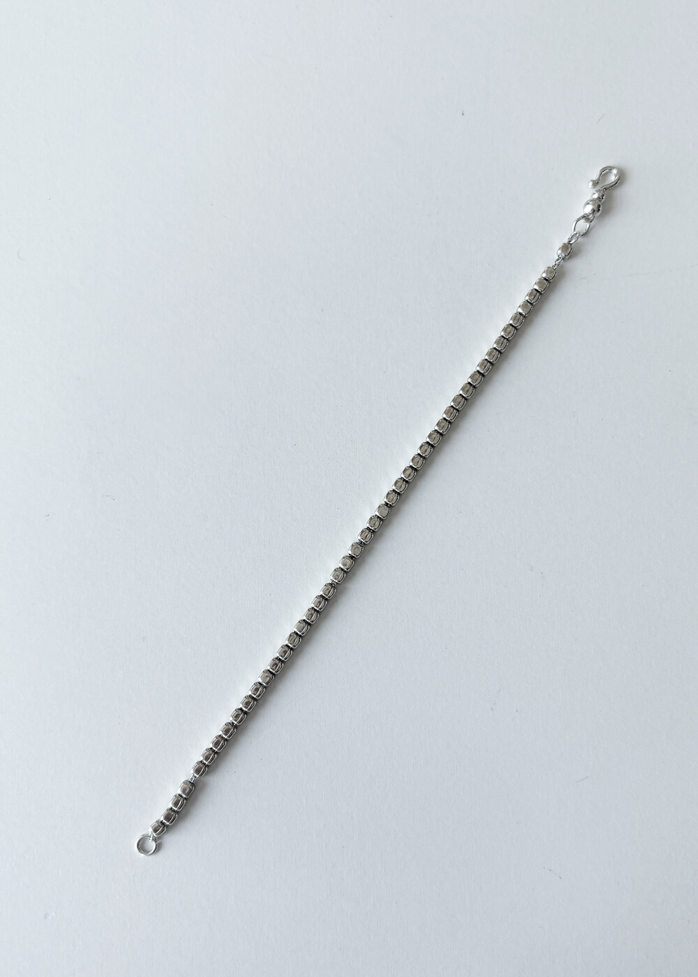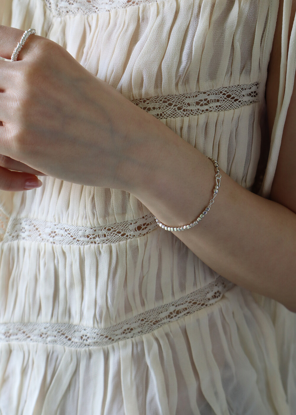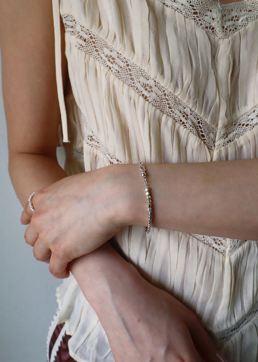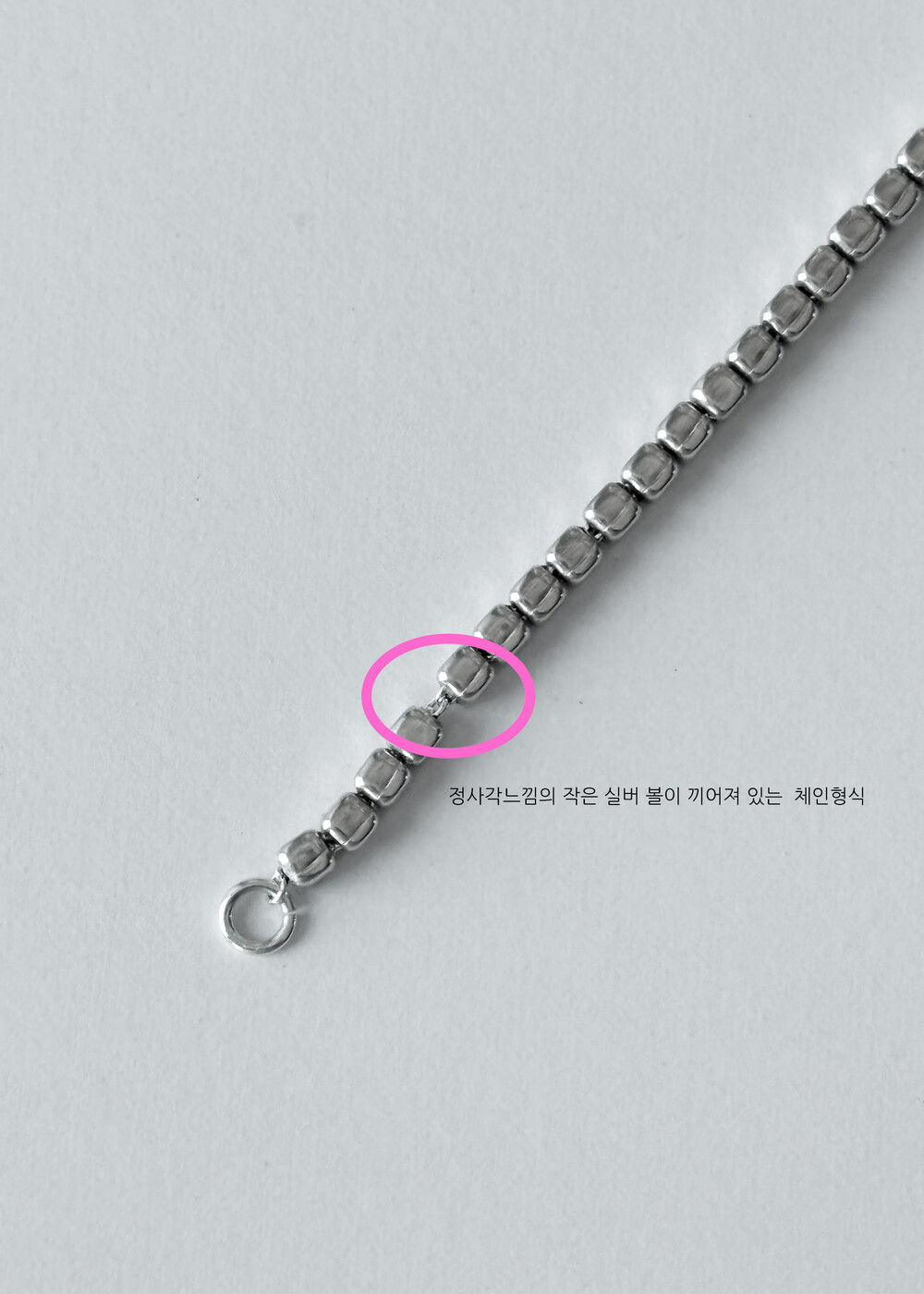 이번 컬렉션 주제인 ' the earth' 를 의미하는 3가지 카테고리 중 대지에 집중하여 재해석한 주얼리로 비정형적인 돌맹이 알맹이들이 비대칭적으로 실버체인에 꿰어져 있는 형식의 제품입니다. 안쪽까지 꽉꽉채워진 은팔찌 체인으로 비정형의 정사각 볼들이 매력적인 제품입니다. 다른 팔찌와 레이어드 하시어 착용하시면 더욱 좋은 체인 브레슬릿이예요!