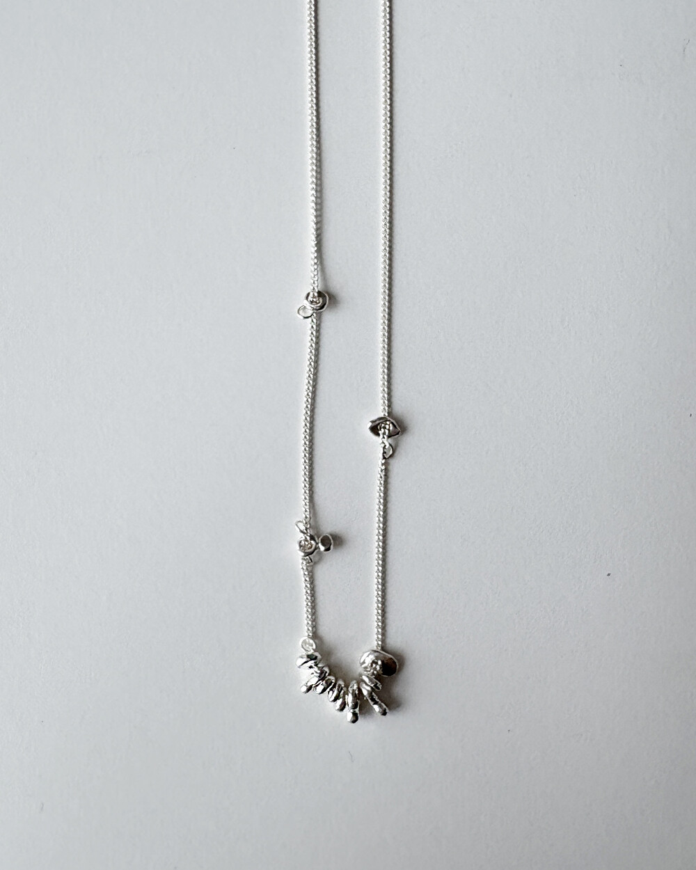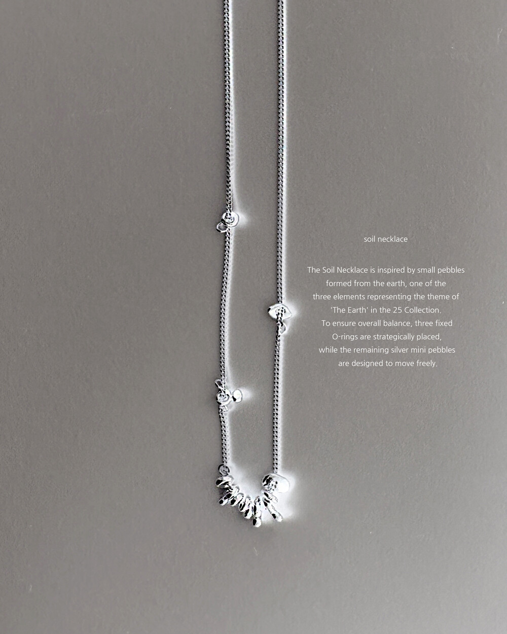 Soil Necklace는 25 컬렉션의 주제인 'The Earth'를 표현하는 세 가지 카테고리 중, 대지에서 비롯된 작은 조약돌에서 영감을 받아 제작된 목걸이입니다. 전체적인 균형을 위해 고정된 O-링이 세 군데에 배치되었으며, 나머지 실버 미니 조약돌들은 자유롭게 움직일 수 있도록 디자인되었습니다.