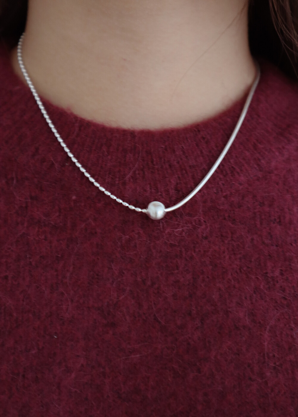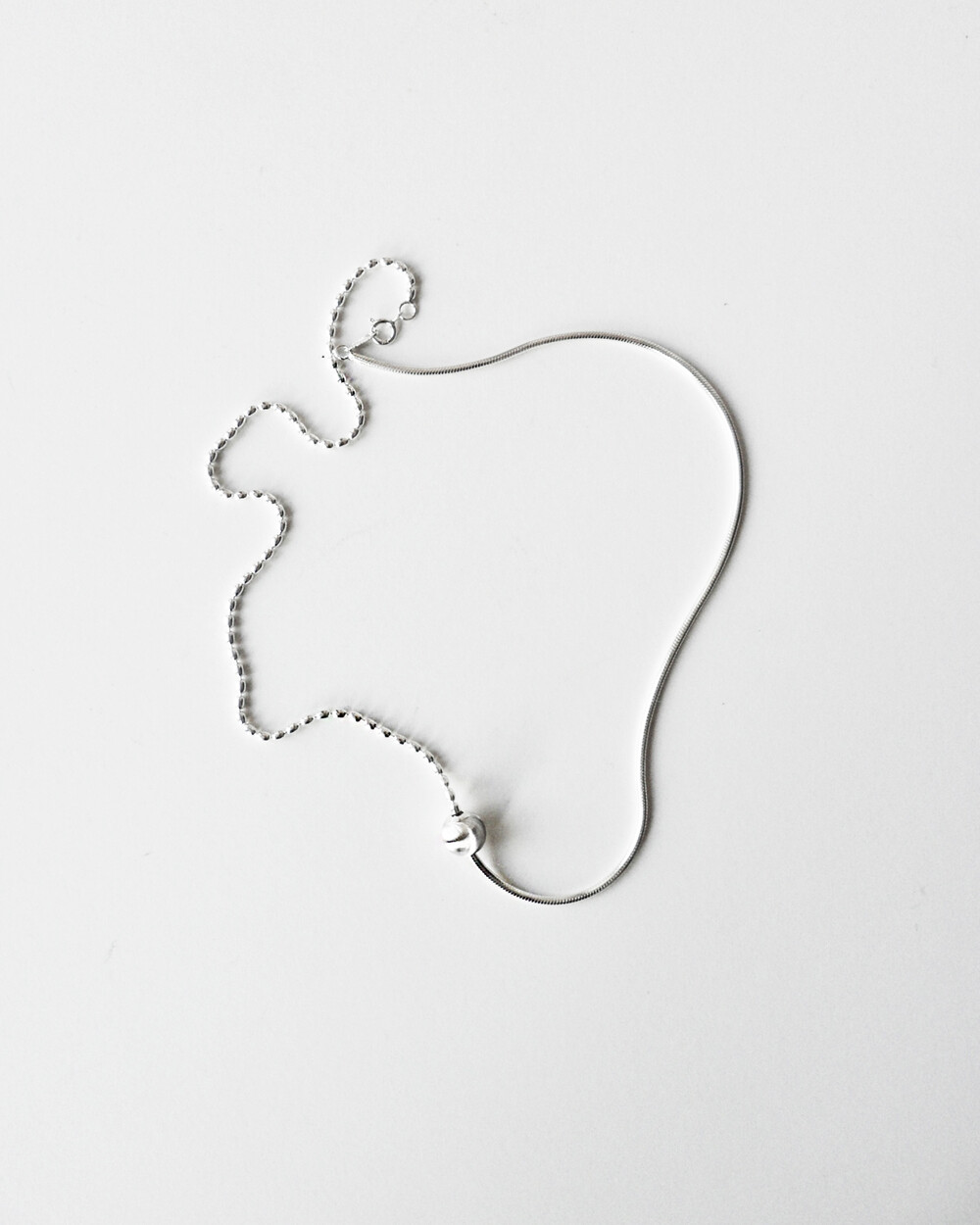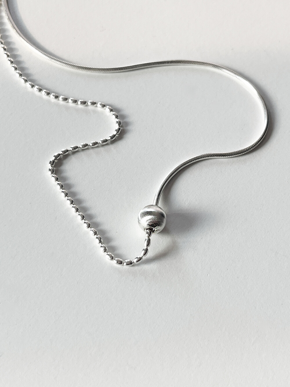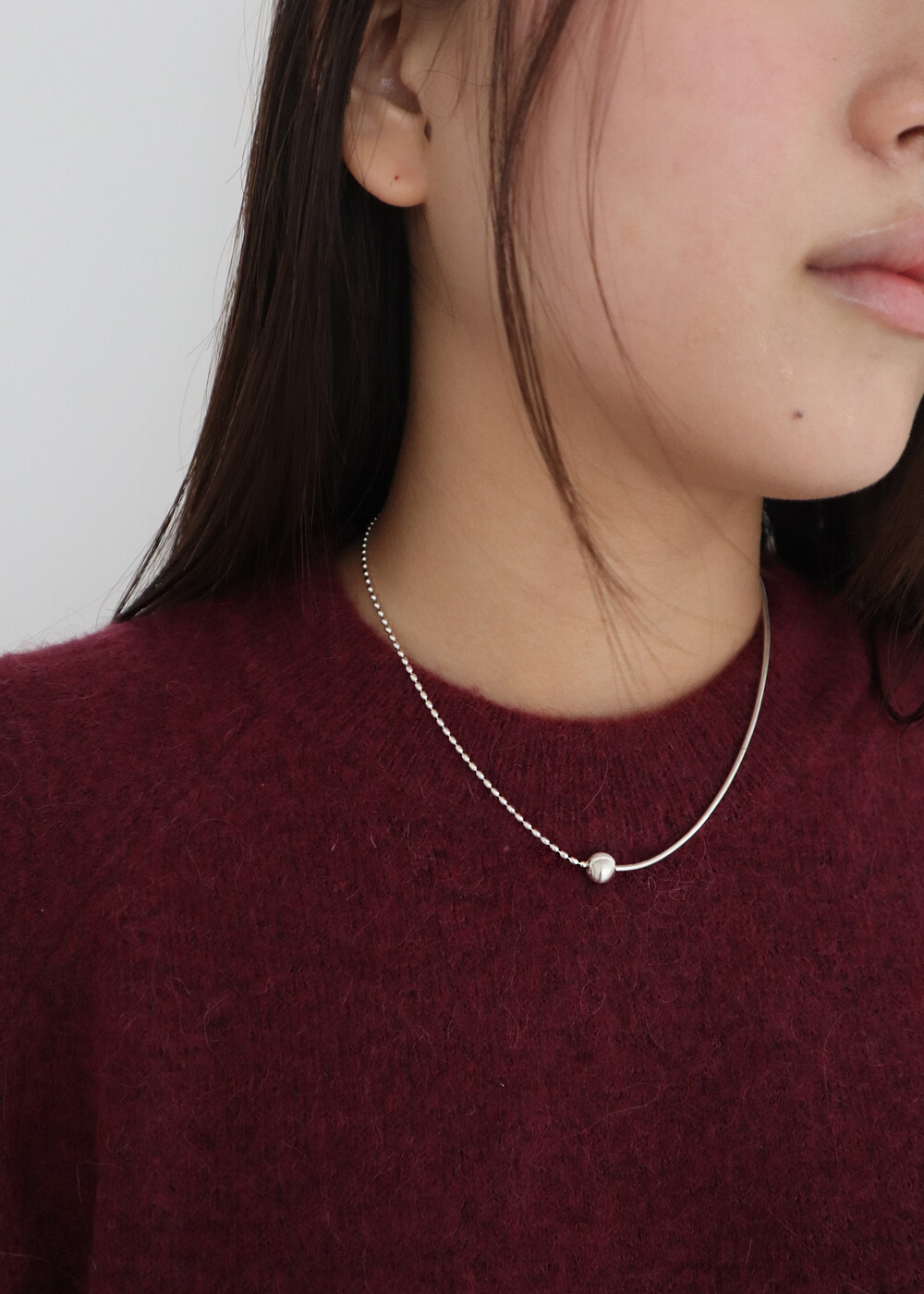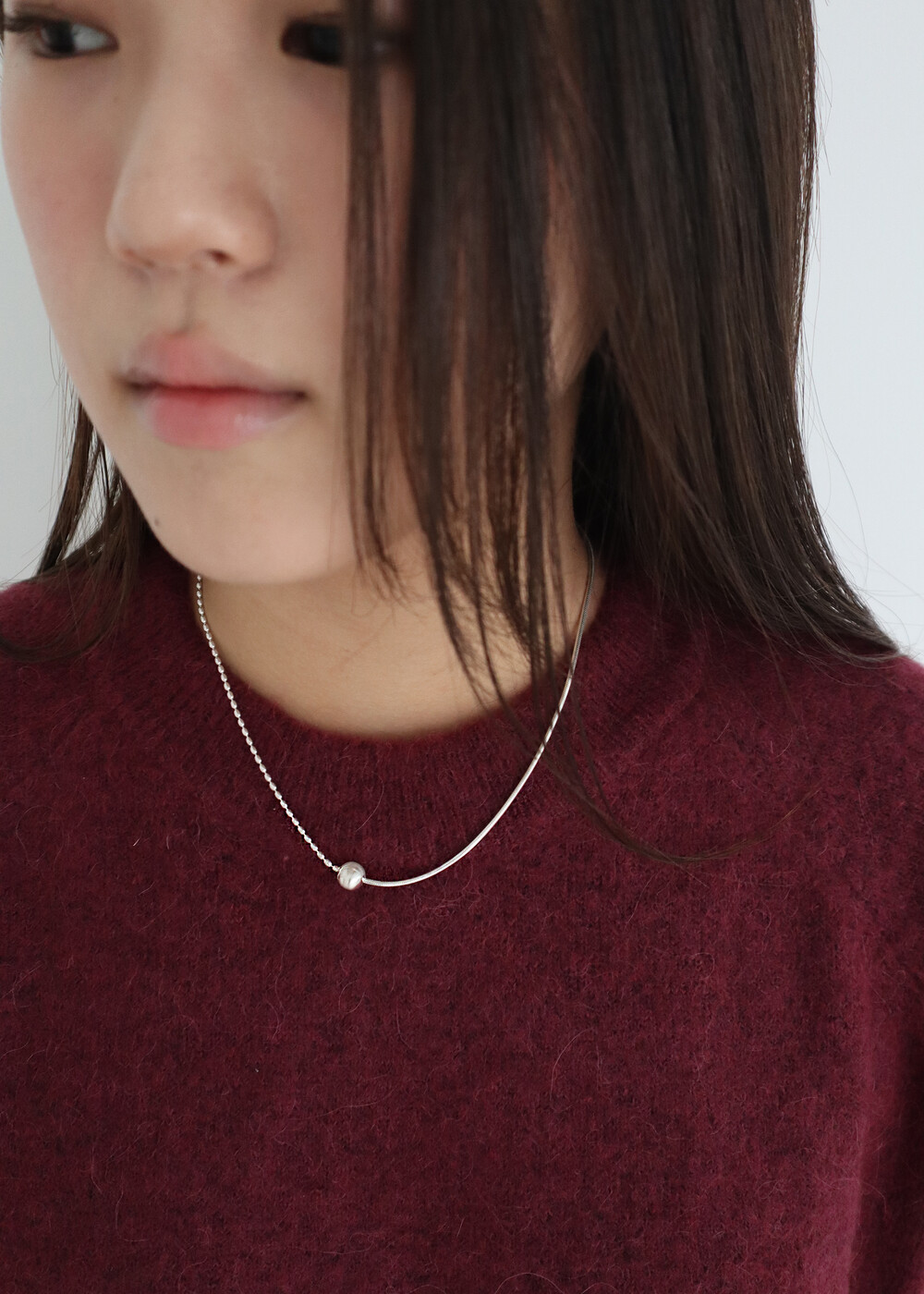 미러볼처럼 은은한 광이 독특하게 빛나는 볼이 포인트인 네크리스입니다. 두 가지 다르느 실버체인으로 제작되었으며 에그볼 체인과 두툼한 스네이크체인의 조화가 데일리한 무드이면서도 연말룩에 잘어울리는 제품입니다. 볼을 가운데 두고 착용해도 좋고, 좌우로 살짝 각도를 틀어 언발란스 느낌으로 착용하셔도 스타일리쉬 합니다.