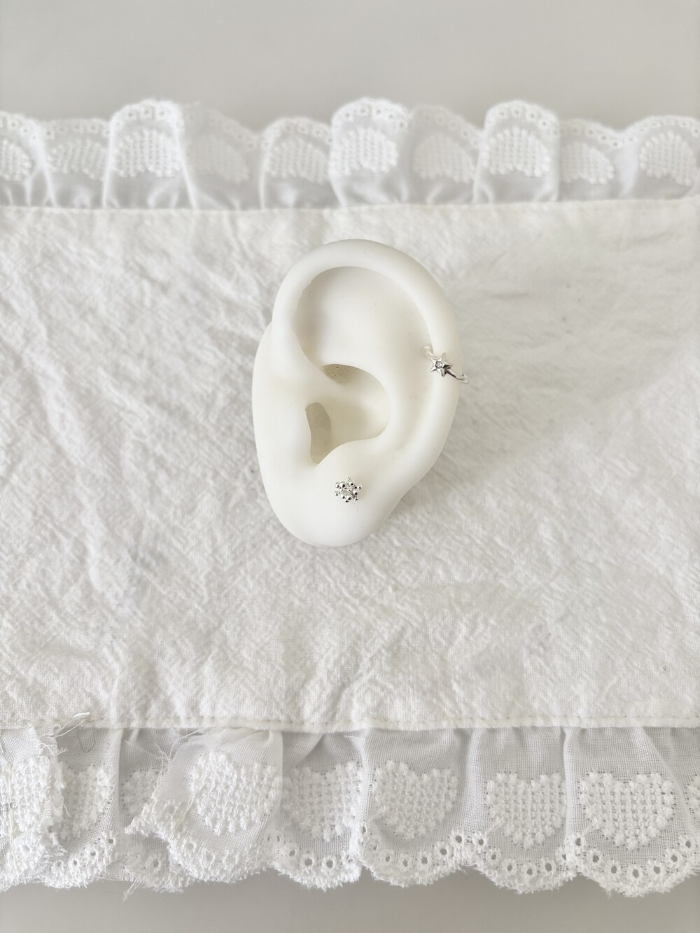 Shine earcuff 샤인 이어커프는 제품명 그대로 화이트 큐빅을 머금은 작은 별 모양의 미니멀한 이어커프입니다.얇고 가벼운 두께로 제작되어 레이어드 스타일링에도 잘 어울리며,이어커프를 처음 착용하시는 분들께도 부담 없이 추천드리는 스타터 제품입니다.