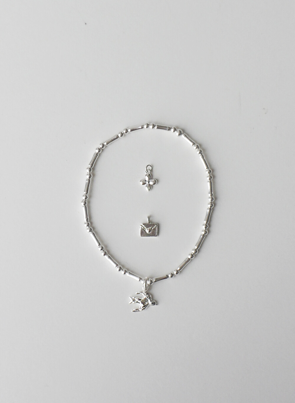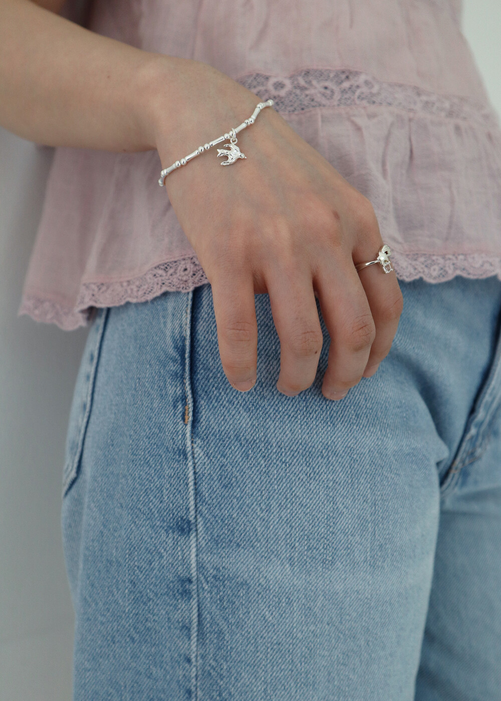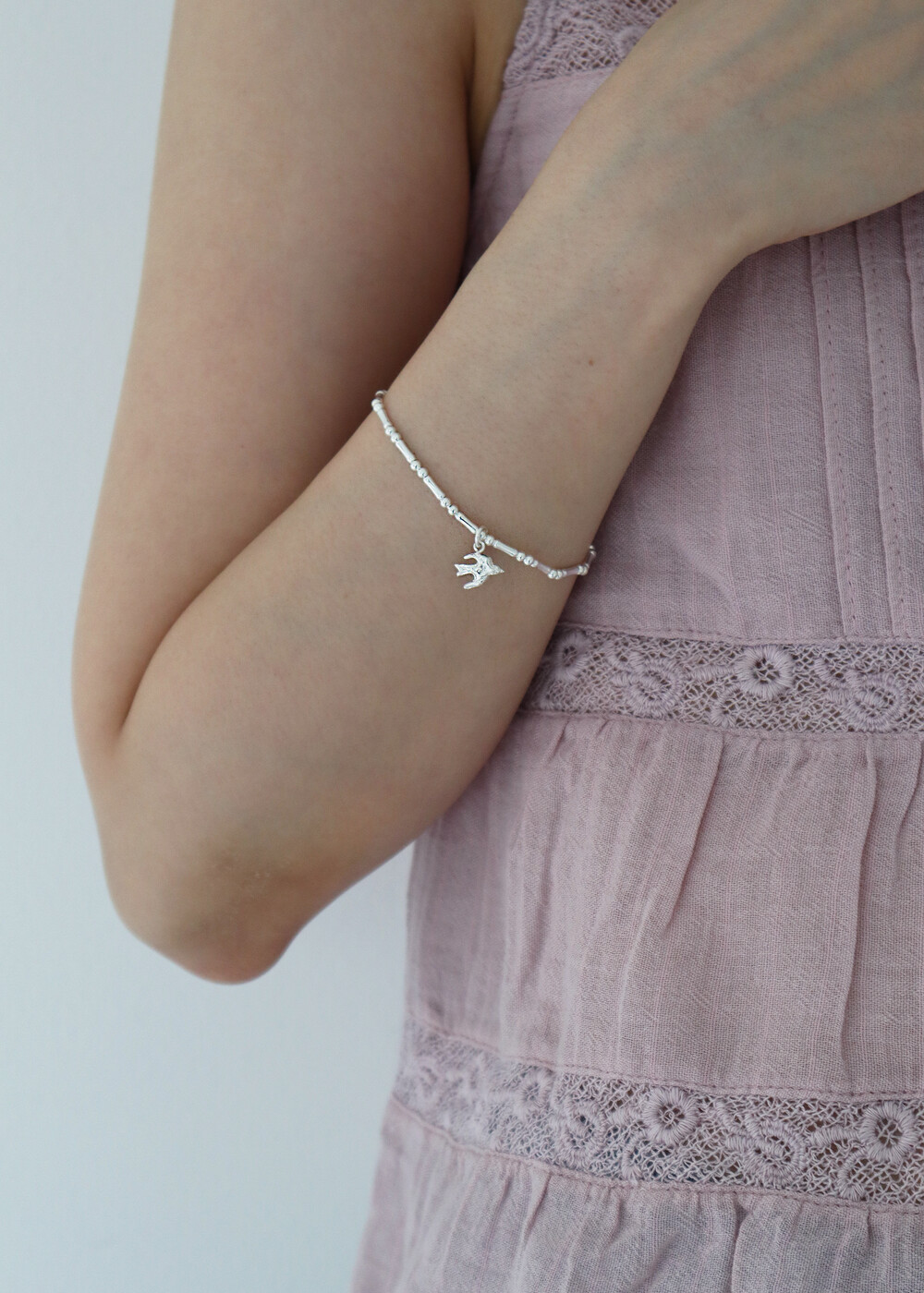 트립 팔찌는 작고 반짝이는 실버 조각들이 우레탄 줄에 꿰어져 있는 심플하고 유니크한 디자인의 팔찌입니다.탄성 있는 원사이즈 우레탄 줄을 사용하여 누구나 사이즈에 구애 없이 편하게 착용하실 수 있으며,포인트로 선택 가능한 팬던트를 추가할 수 있어 나만의 개성을 더할 수 있는 아이템입니다.