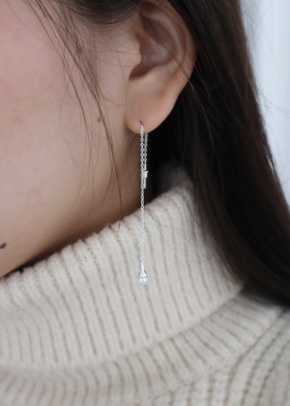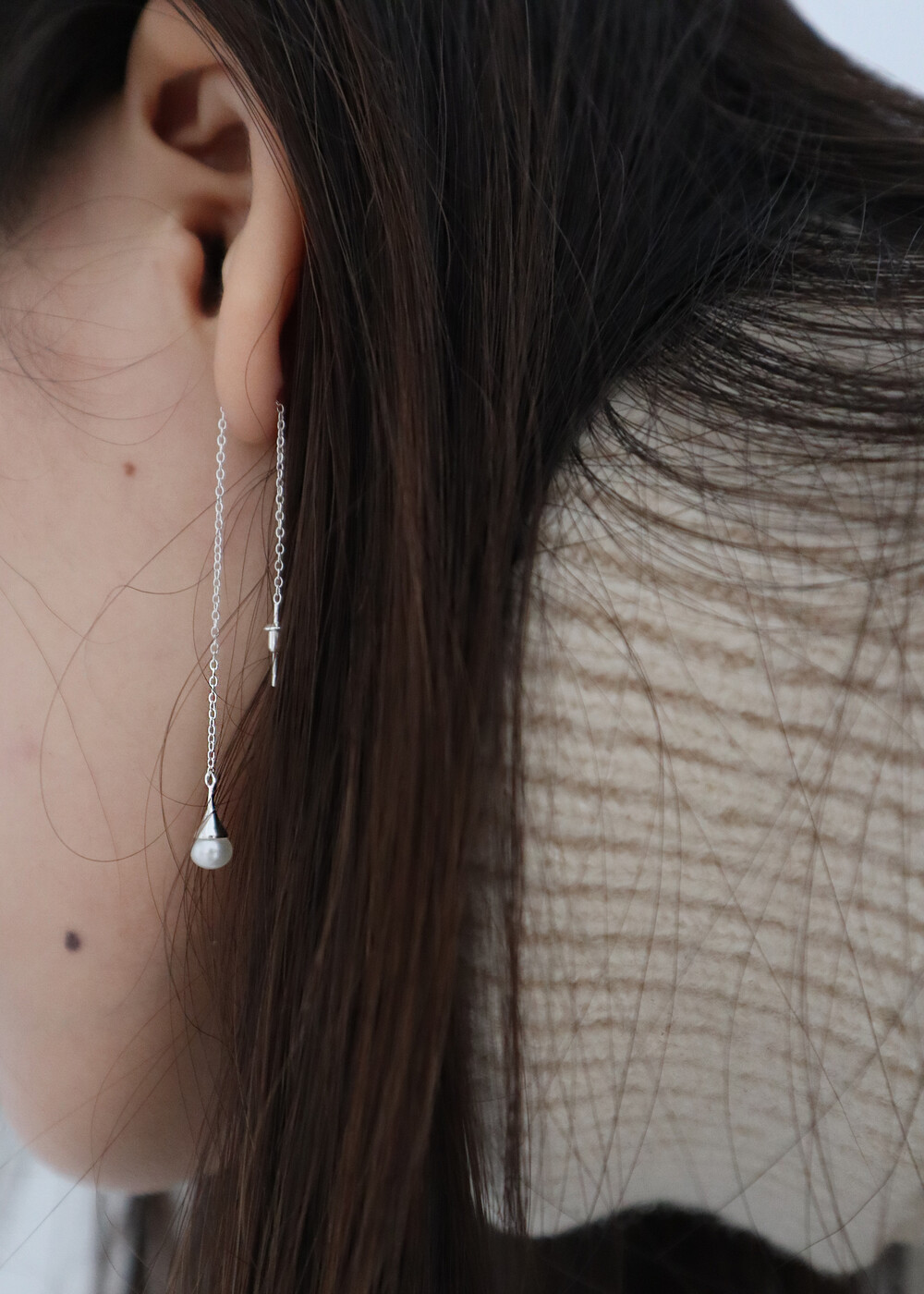 작은 담수진주가 물방울 형태로 달린 롱 스타일의 귀걸이 입니다. 양쪽 착용시 다른 기장감으로 연출하여 착용하실 수 있습니다.