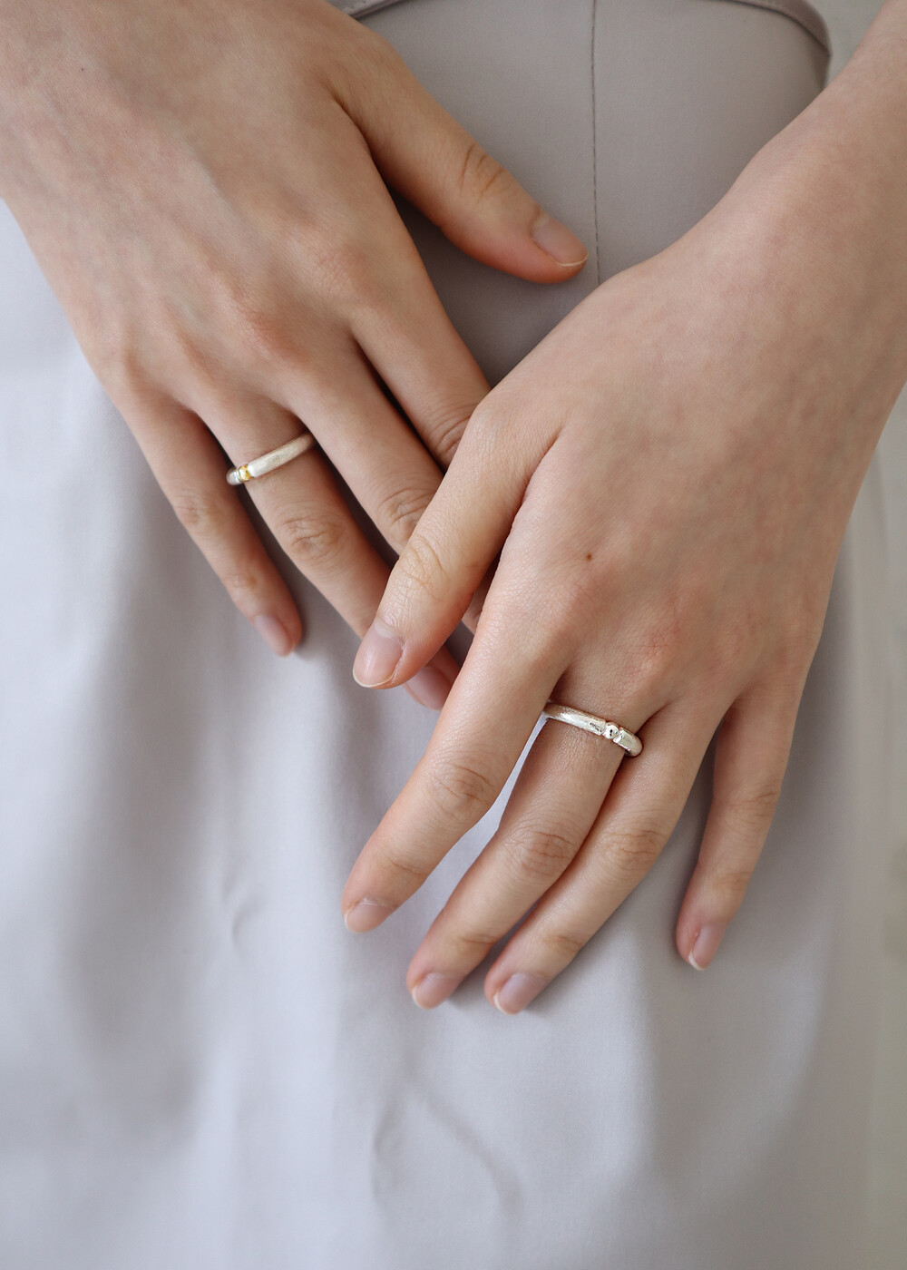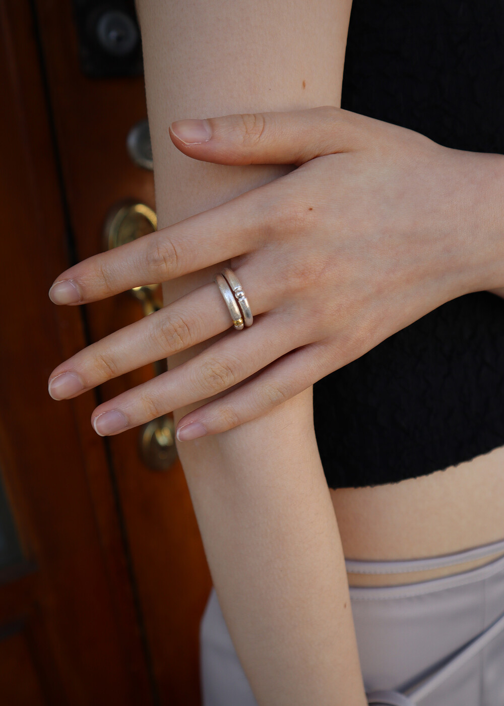 전체 일정한 두께로 심플하게 단독으로 착용하시거나, 두개를 겹쳐 쌍가락지 느낌으로 레이어드 하셔도 좋은 제품입니다. 가운데 작은 볼 부분을 제외하고 전체 샌딩 기법을 통하여 더욱 반짝이는 모래알 같은 마감처리를 하였습니다.