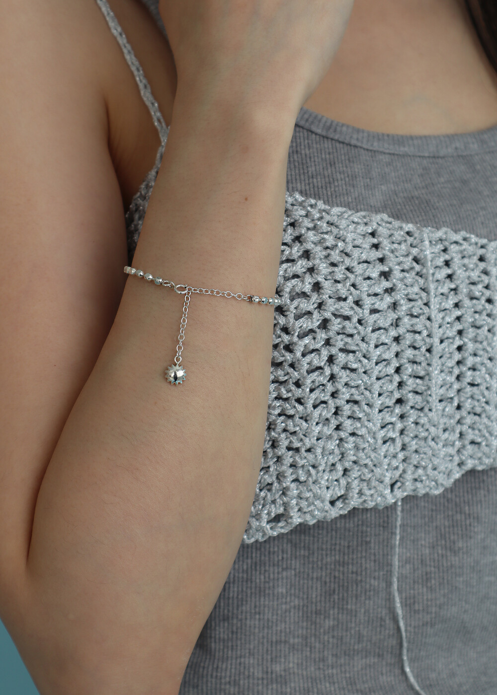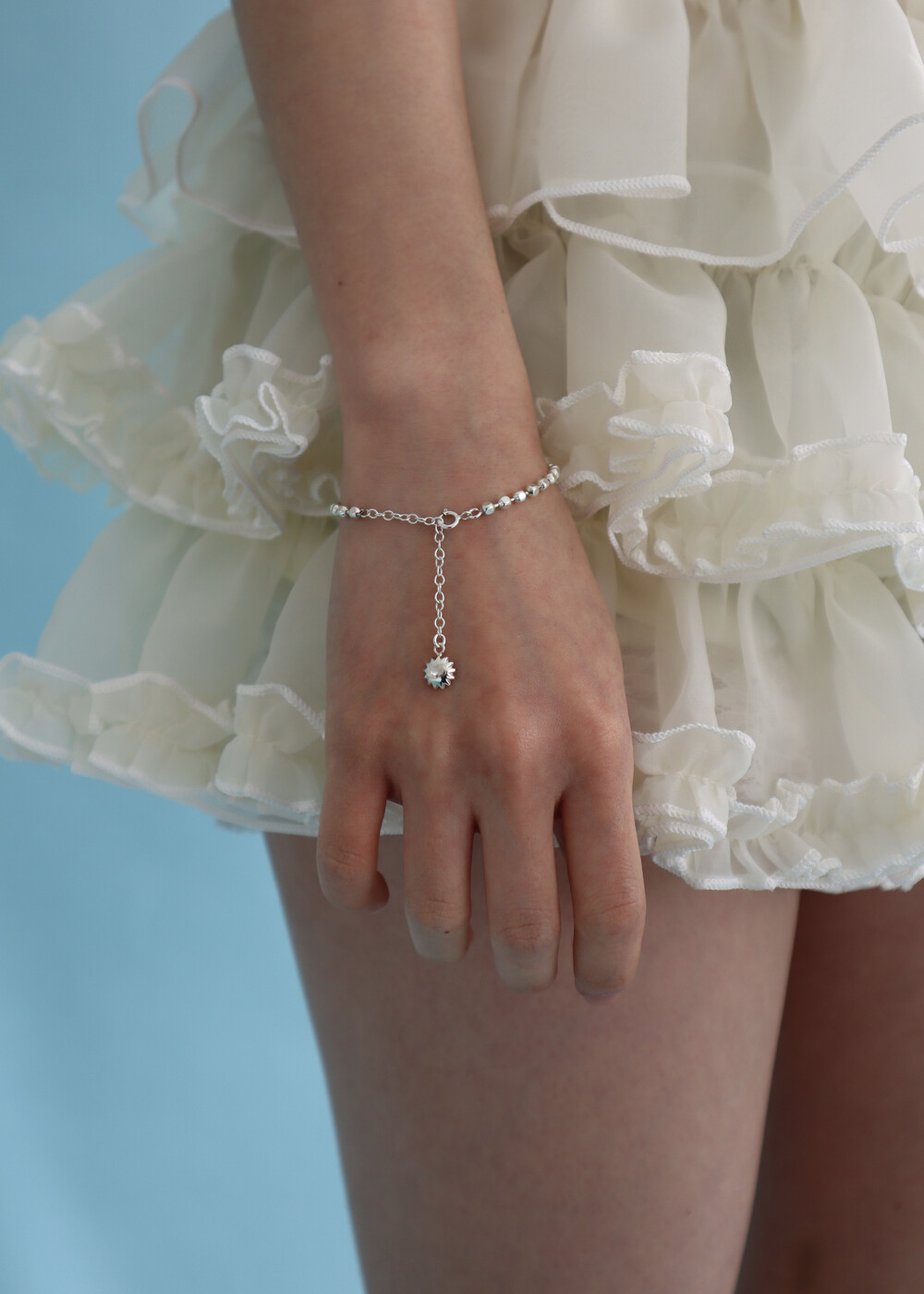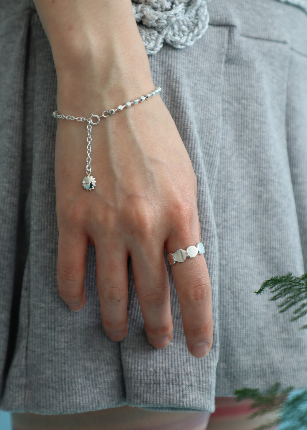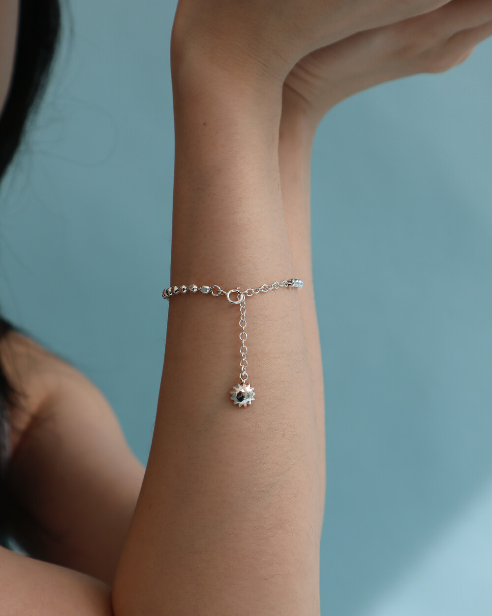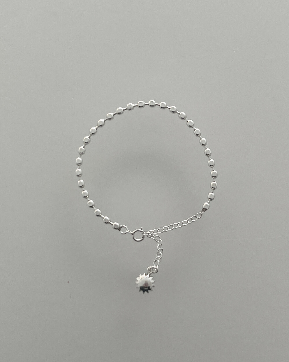 해바라기를 닯은 꽃 모양의 팔찌 입니다. 식빵처럼 통통한 볼체인의 결함으로 봄여름 반짝이게 포인트 주기 좋고 계절이나 유행에 따르지않아 데일리하게 착용하실 수 있습니다. 보조줄 장식으로 팔목에 맞추어 편한 착용이 가능합니다.