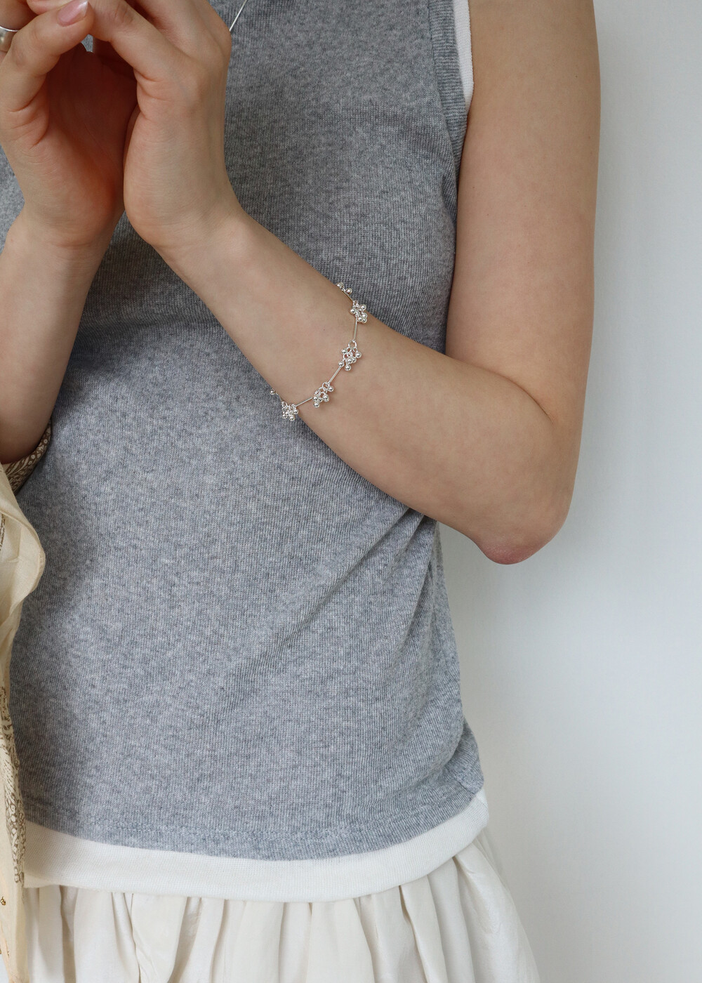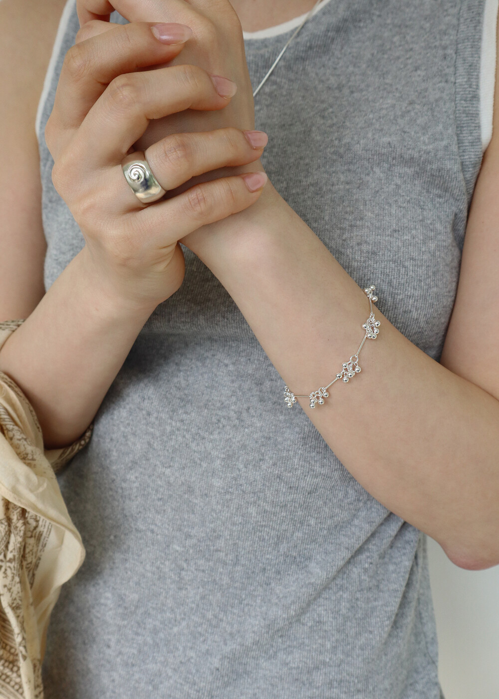 버블버블 비눗방울이 연상되는 작은 볼들이 달린 귀여운 방울방울 브레슬릿 입니다. 뽀얀 실버 컬러가 빛나는 봄여름 계절 포인트 팔찌로 추천드립니다.