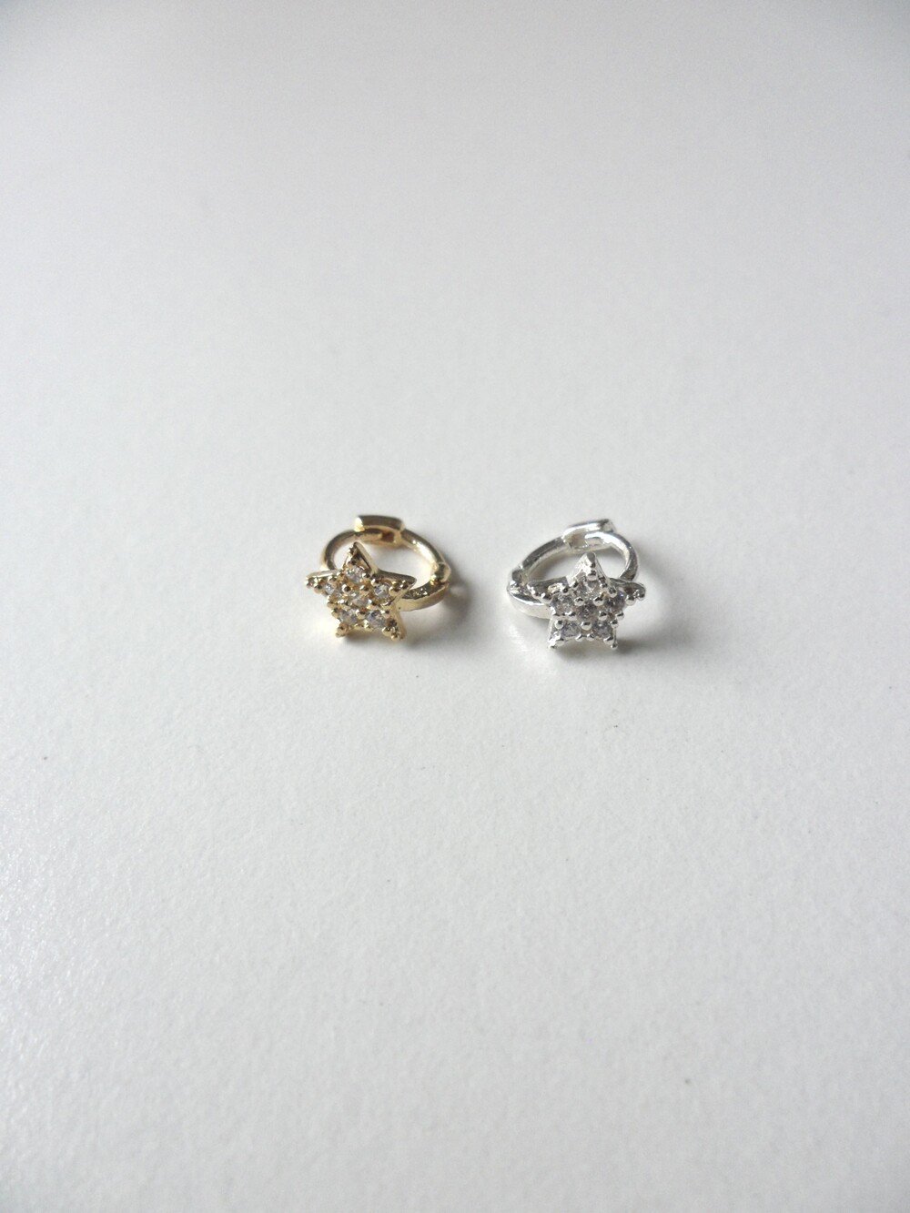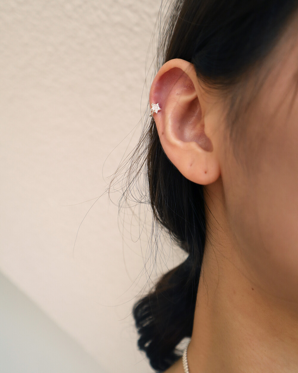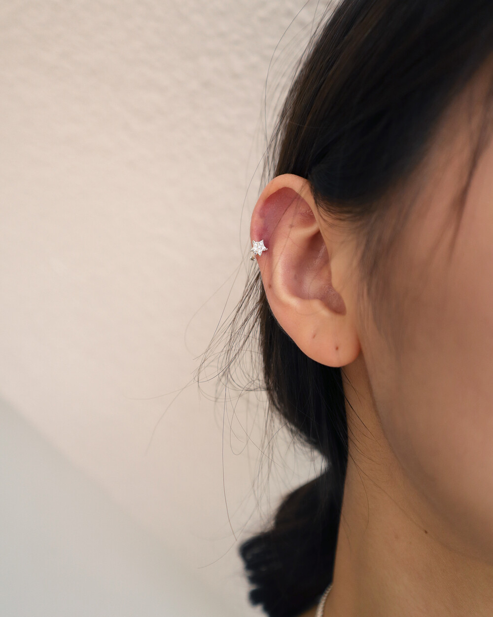 작은 별모양에 반짝이는 큐빅이 여러개 세팅된 미니 피어싱입니다. 원터치 형식으로 보다 더 편리하게 착용이 가능합니다.