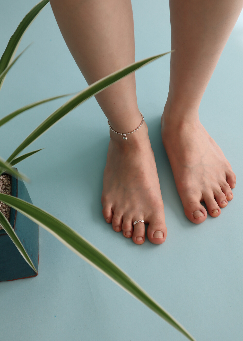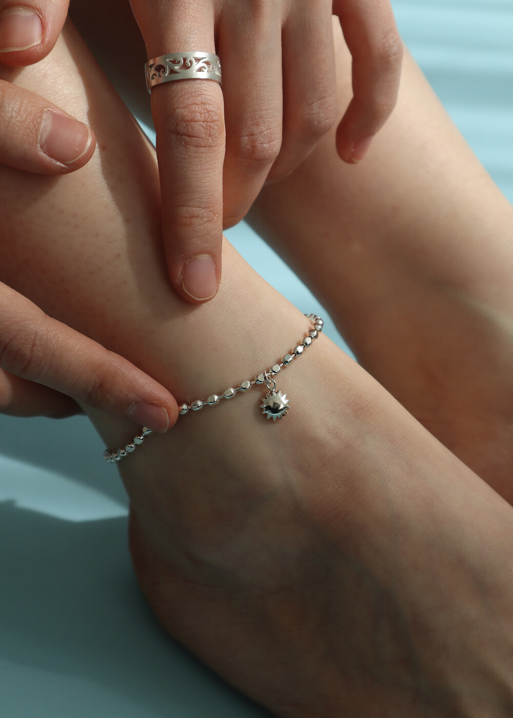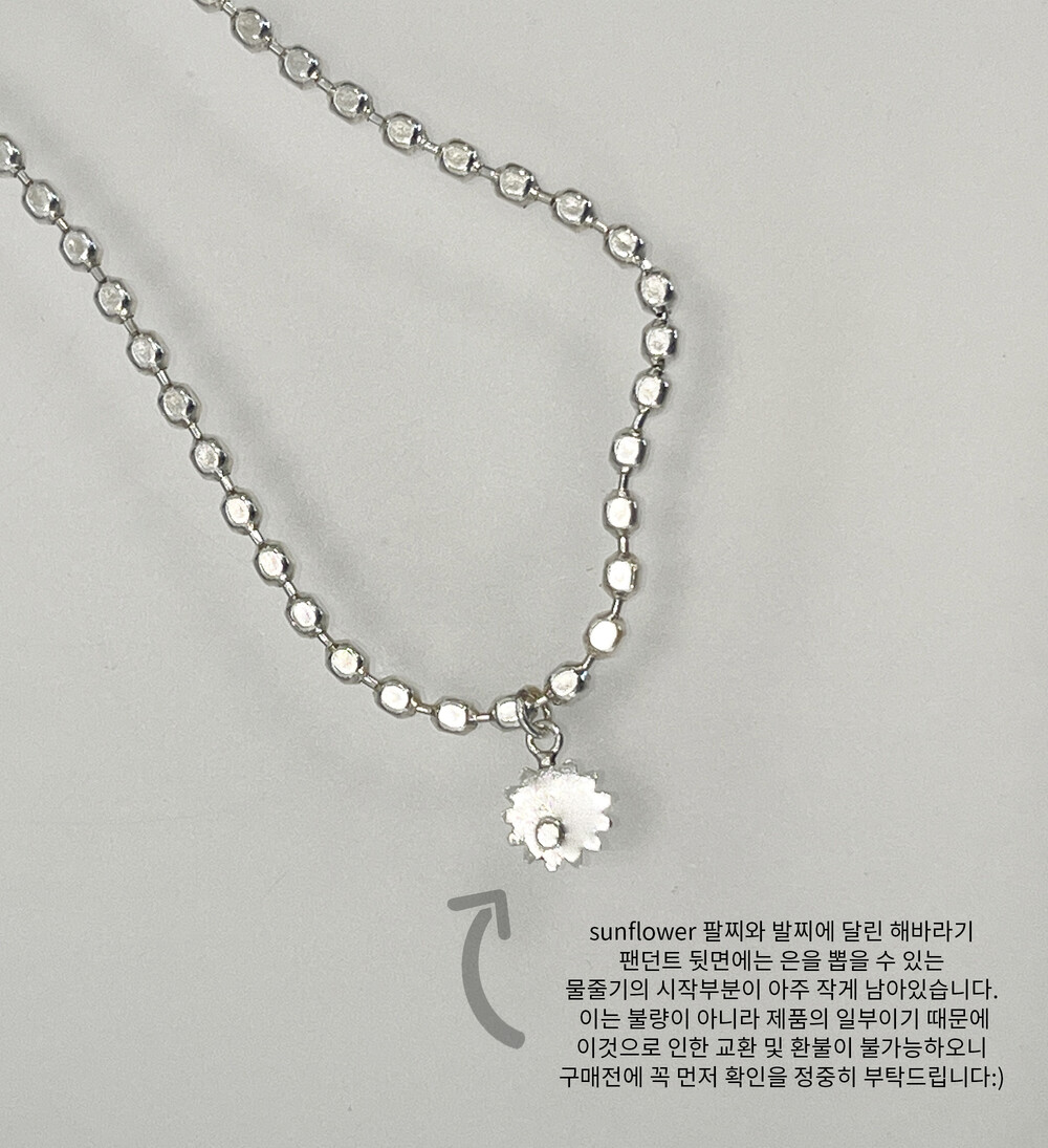 해바라기를 닯은 꽃 모양의 발찌 입니다. 식빵처럼 통통한 볼체인의 결함으로 봄여름 반짝이게 포인트 주기 좋고 계절이나 유행에 따르지않아 데일리하게 착용하실 수 있습니다. 보조줄 장식으로 발목에 맞추어 편한 착용이 가능합니다.