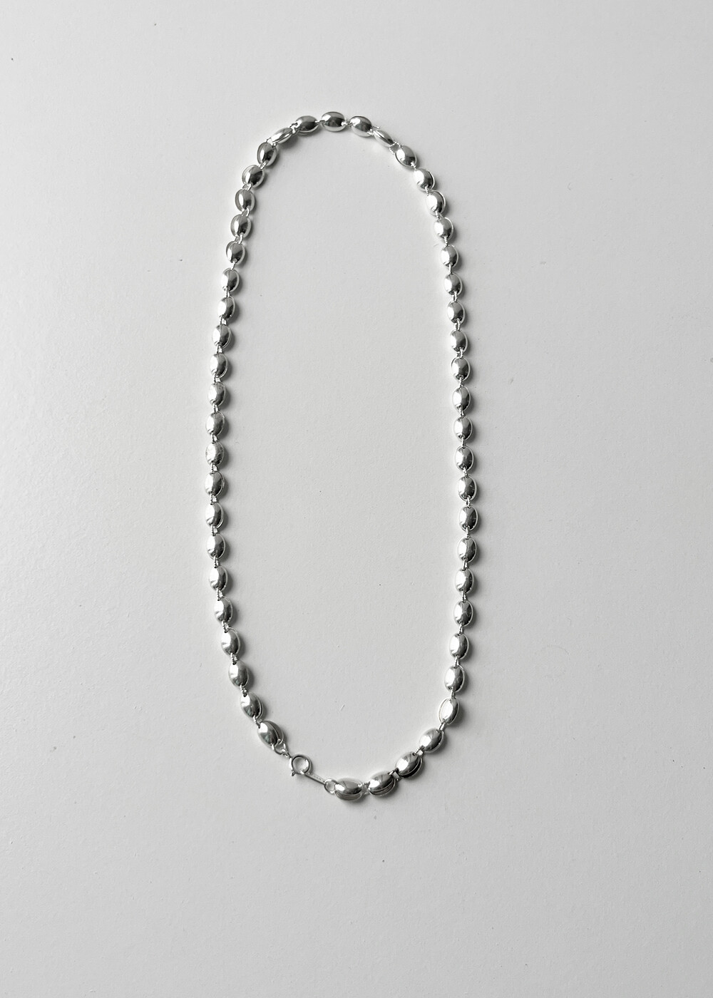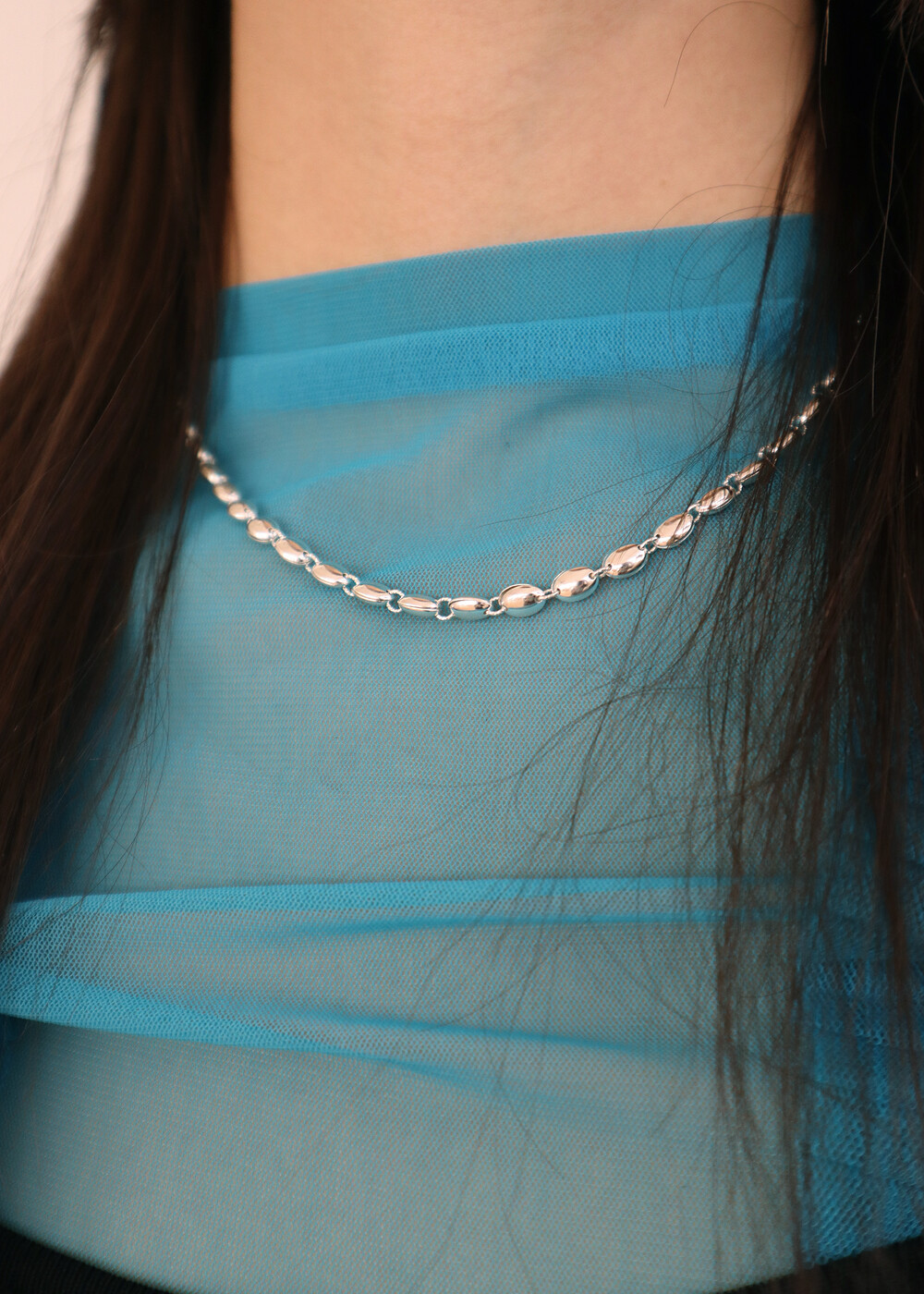보리를 닮은 실버 체인입니다. 체인에 두개의 타원모양의 팬던트가 맞대어 합쳐진 섬세한 체인으로 스타일리쉬하게 착용하실 수 있습니다. 공정과정에 손이 매우많이가는 체인이지만 라이트한 중량감과 단독으로 착용하셨을때도 확실한 포인트가 되는 제품입니다.