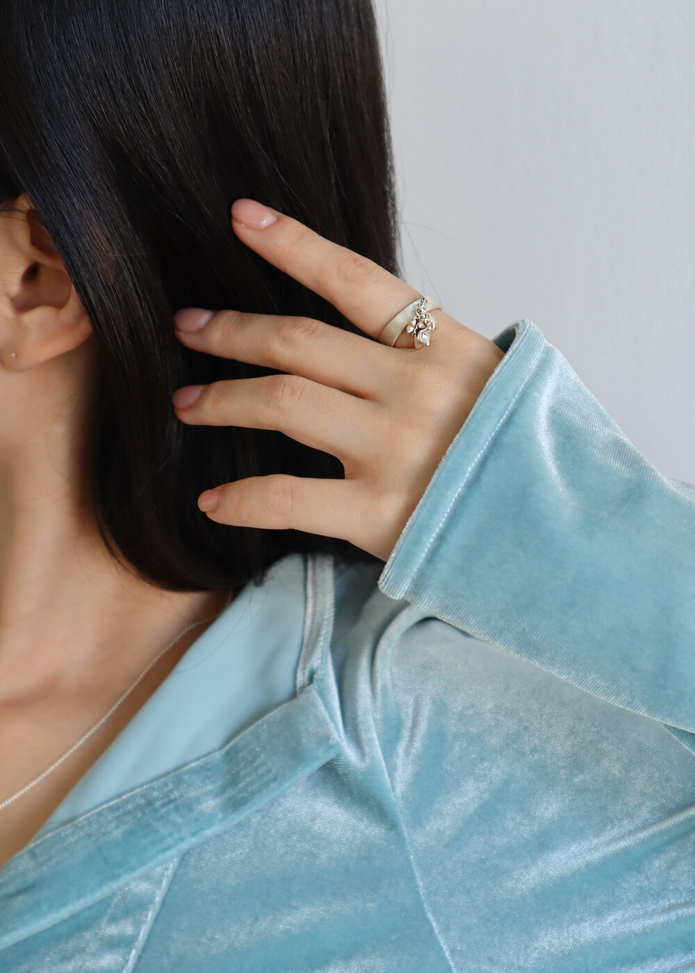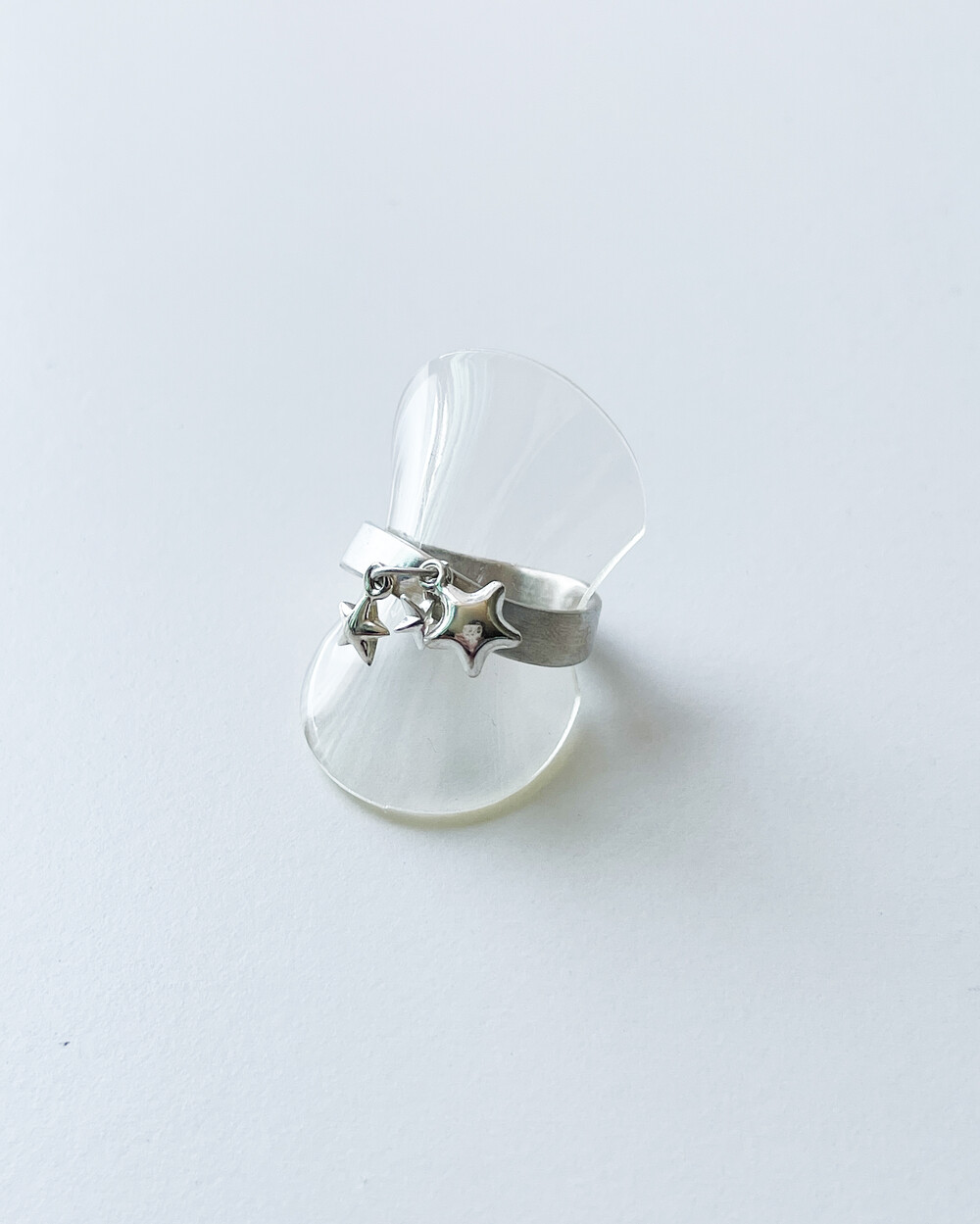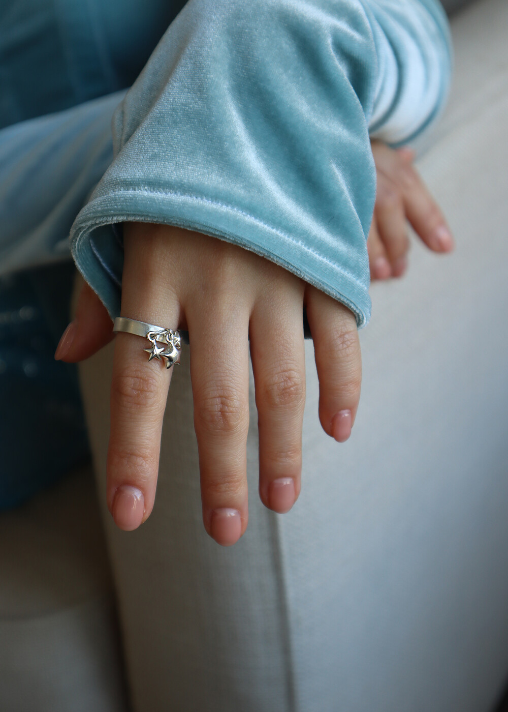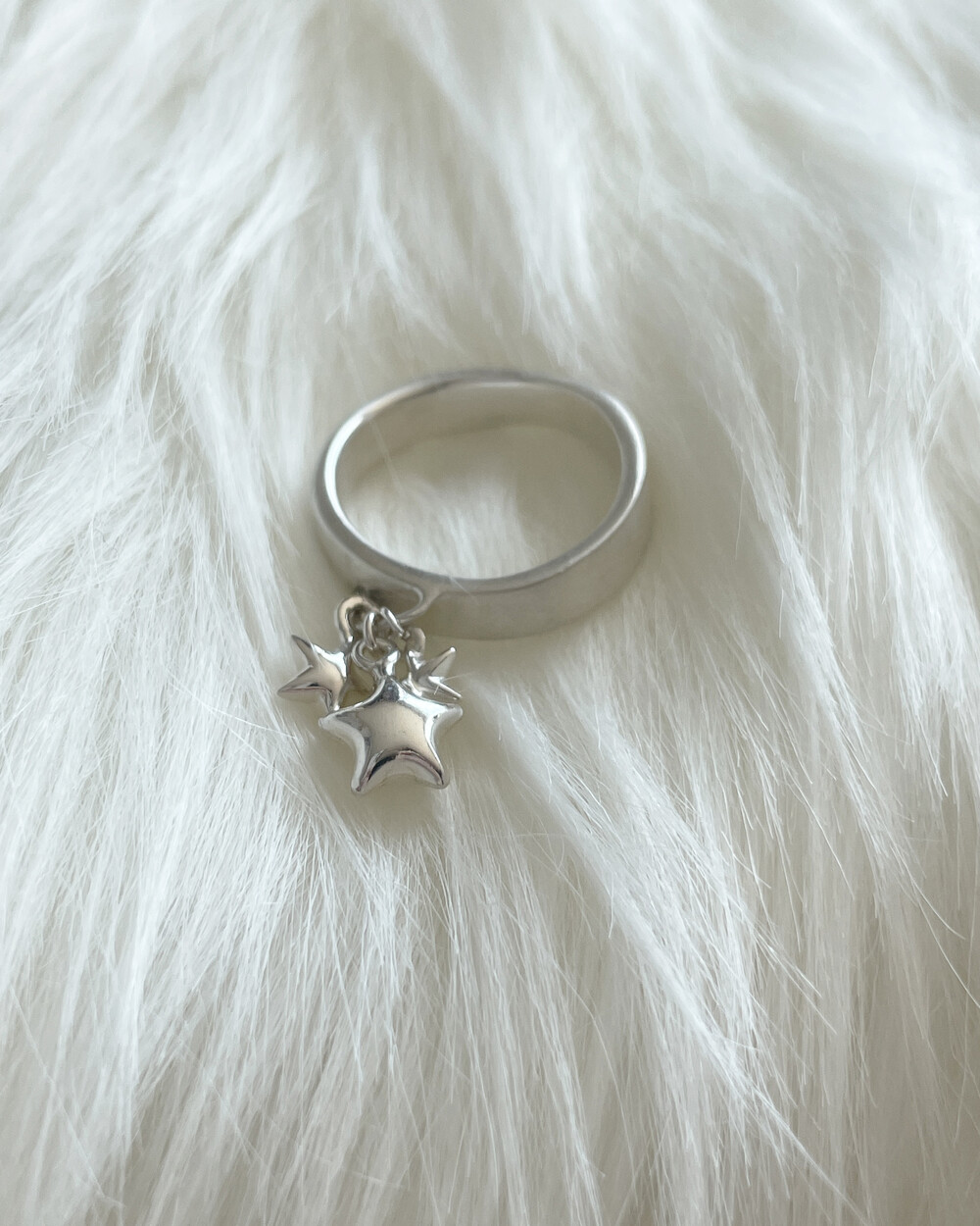 세가지 다른 사이즈의 별 딸랑이가 조합되어있는 무광 반지 입니다. 일반 평반지 모양이 아닌 부드러운 곡선의 형태로 되어있습니다 .