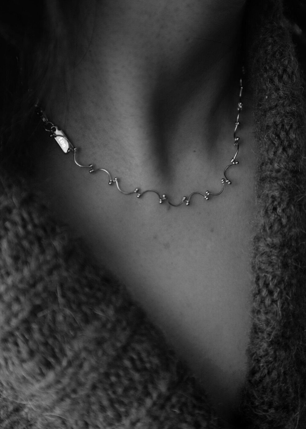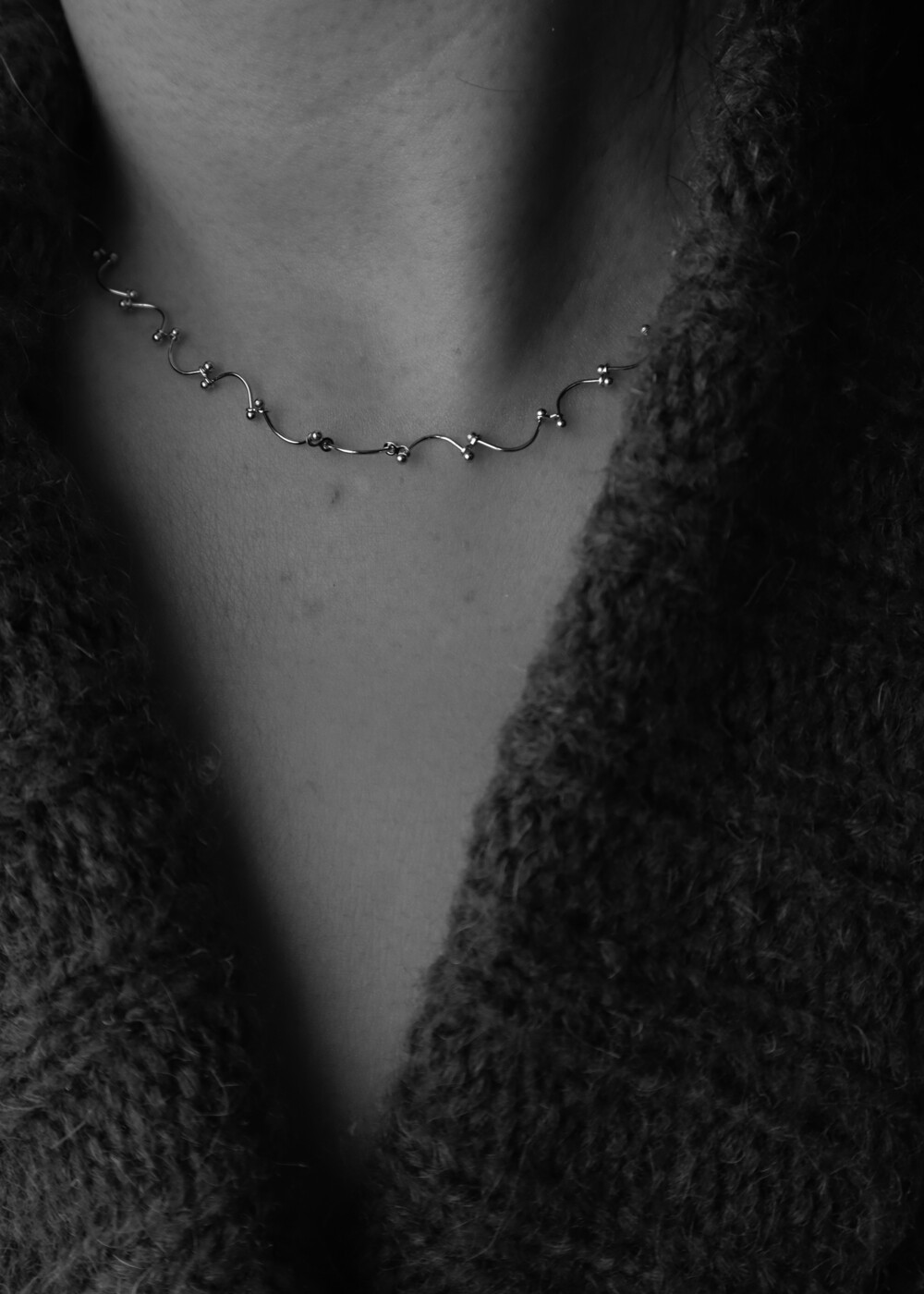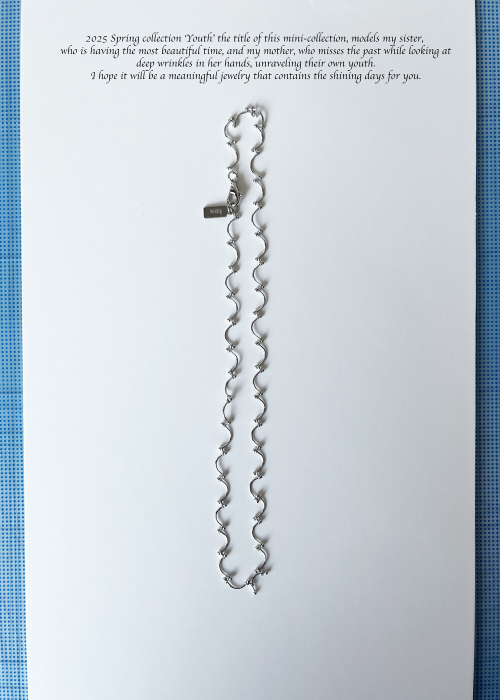 작고 얇은 곡선의 바 들이 얽혀 유연한 흐름을 나타내는 네크리스입니다. 브라스 소재에 백금 도금을 더하여 변함없이 오래 반짝임을 유지할 수 있습니다. 얇은 체인으로 단독체인시 쵸커처럼 착용하심을 추천드리며, 다른 목걸이와도 레이어드 하시기 좋은 사이즈와 중량감을 선보입니다.