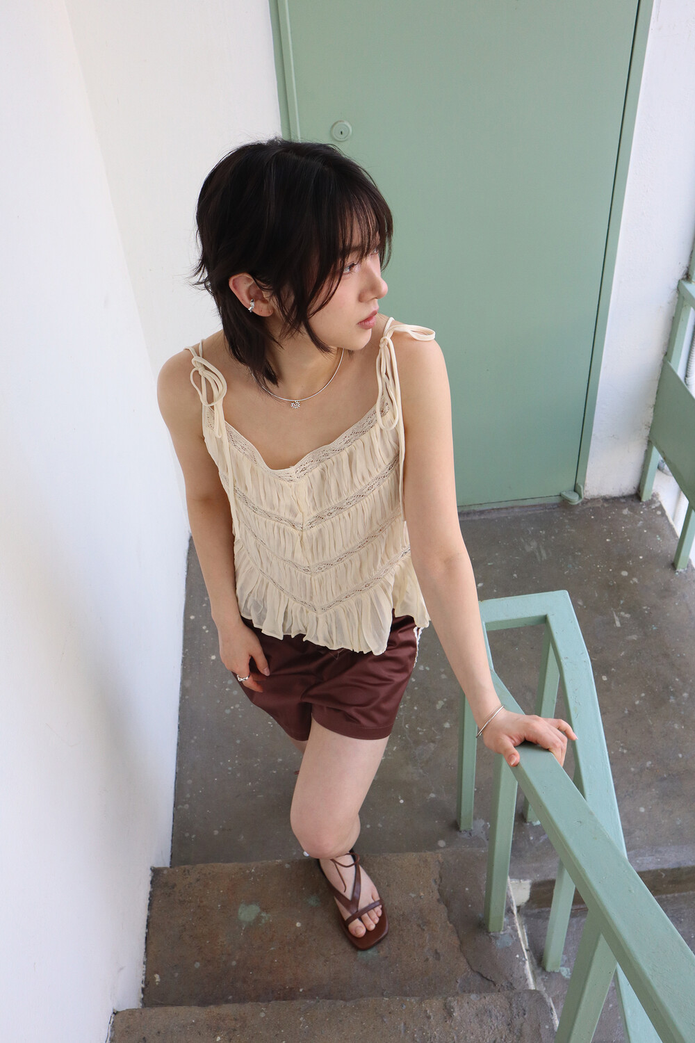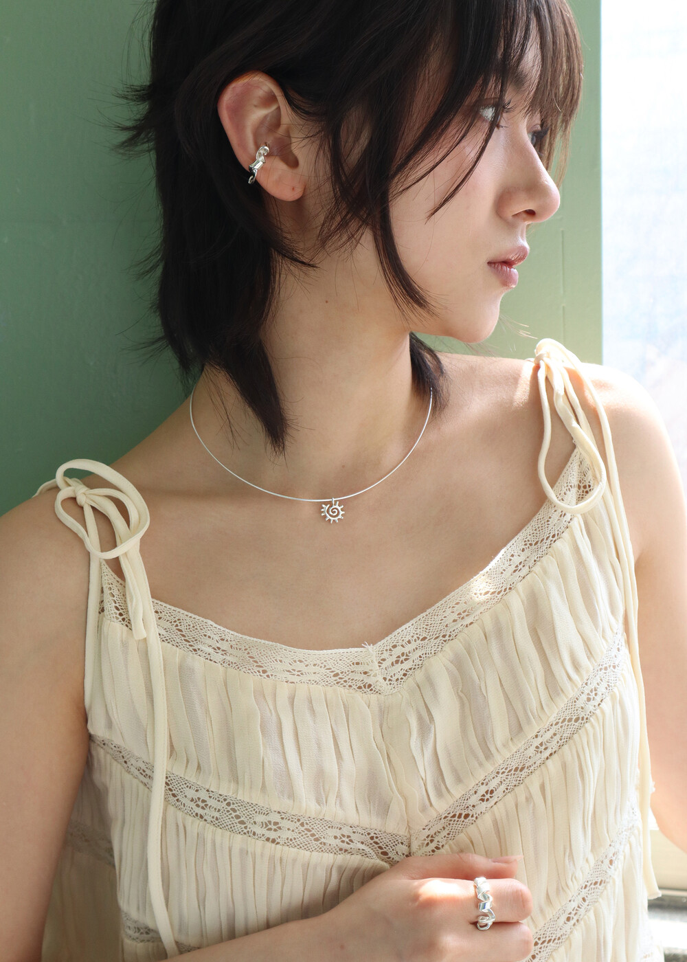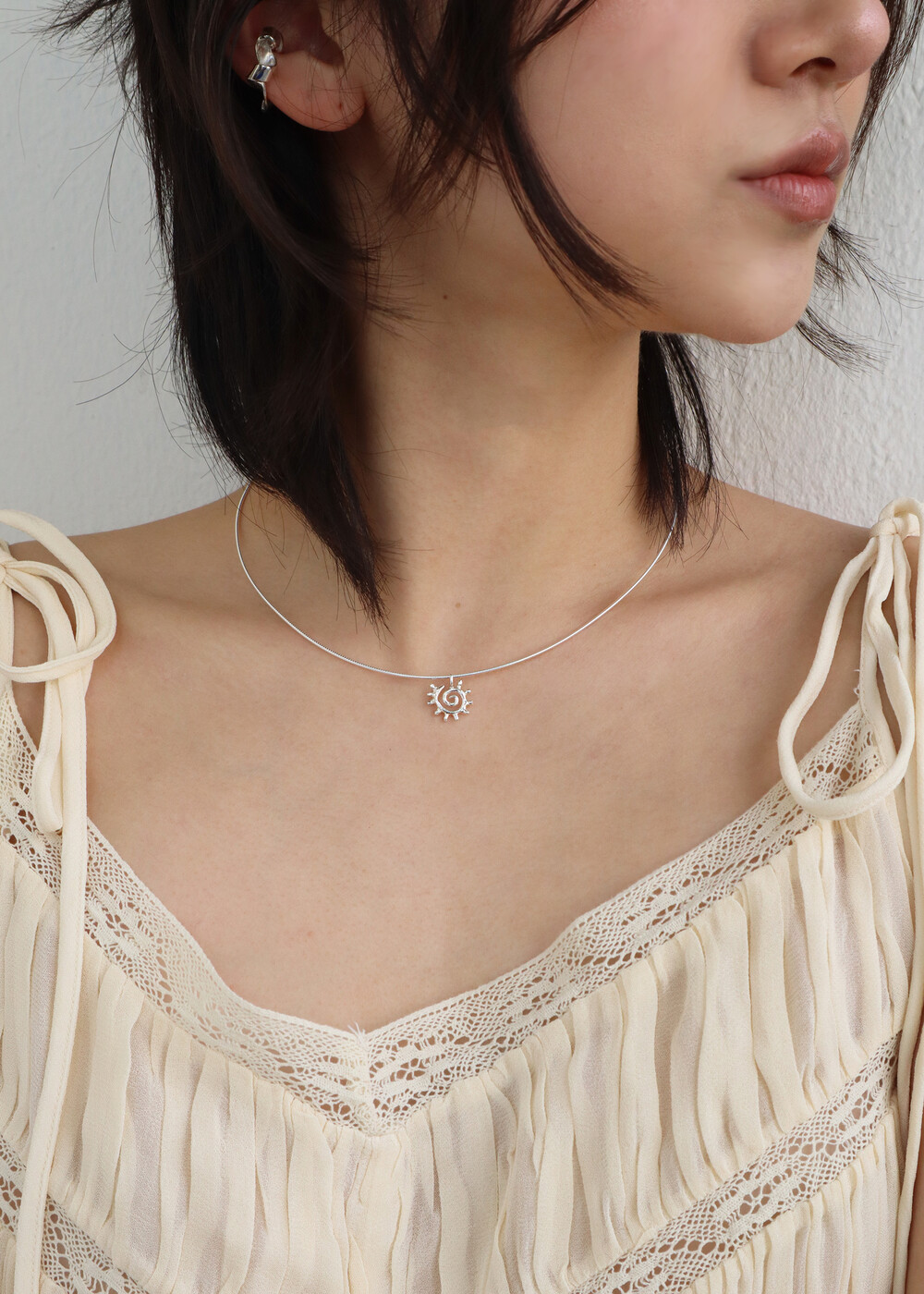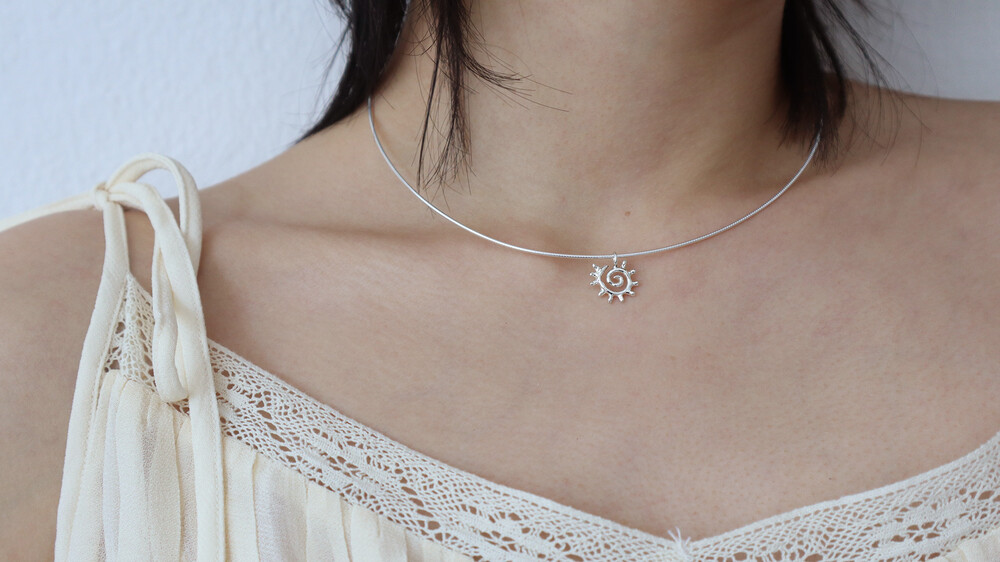 흐물거리는 유연한 체인이 아닌 텐션감 있는 스네이크 체인으로 뱅글형태로 딱 떨어지는 네크리스입니다. 이번 컬렉션 주제중 해 를 모티브로 제작되었으며 삐죽 뿔이난 듯 한 해 모양이 포인트인 팬던트가 달려있어요. 사이즈는 총장 40cm 로 원사이즈로 나왔지만 좀더 길게 착용을 원하실 경우 옵션에서 보조줄을 추가하실 수 있습니다. 여름에 시원하게 착용하시기 너무좋고 수영복에도 비치룩에도 잘어울릴 추천 아이템입니다.